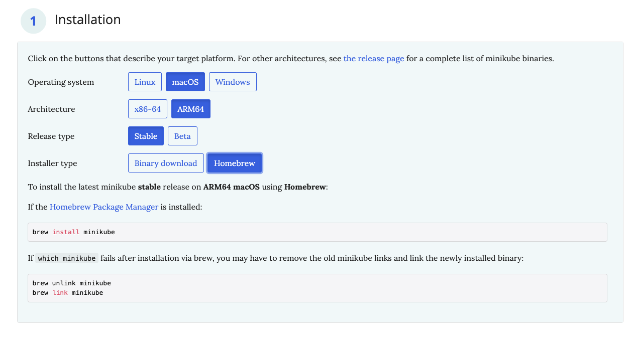 이번 학습에서는 쿠버네티스가 아닌 미니큐브를 사용해 볼 것이다. 미니큐브는 쿠버네티스를 쉽게 배우고 개발할 수 있도록 만들어진 로컬 쿠버네티스라고 한다. 링크로 이동하면 설치를 하기위한 명령어 가이드가 있다. 필자는 Macbook M1을 사용하고 있기에 아래와 같이 선택해 주고, homebrew 설치 방식을 택해서 설치해 주었다.