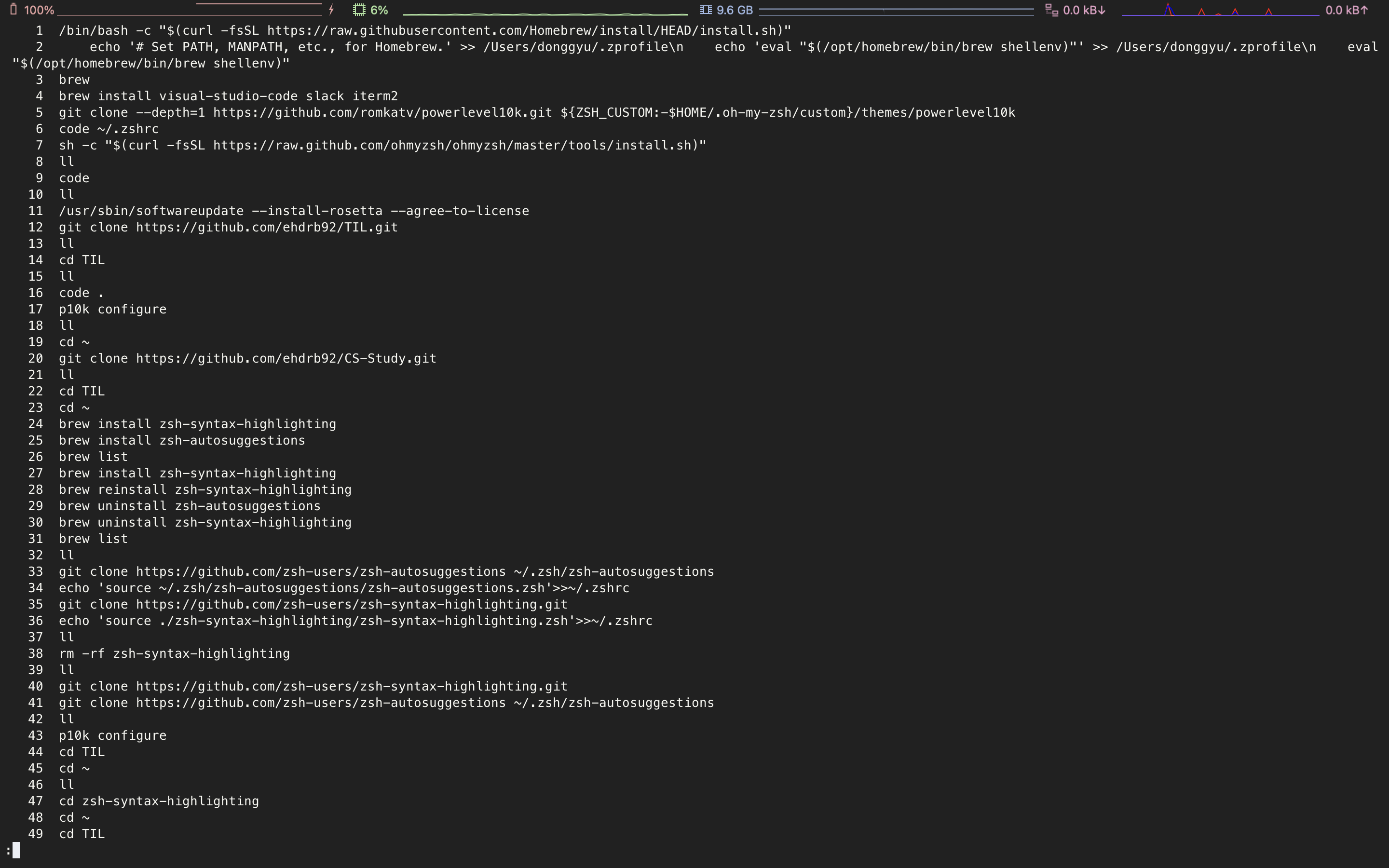 위는 필자의 로컬에서 "history"를 입력하여 나온 결과이다. 가장 최근 사용한 명령어부터 위로 갈수록 오래된 명령어들이 나열된다. 스크롤을 올리면 계속해서 나오는 모습을 볼 수 있다. 하지만 이 또한 전체 기록을 한꺼번에 다 보여주기 때문에 불편하다.